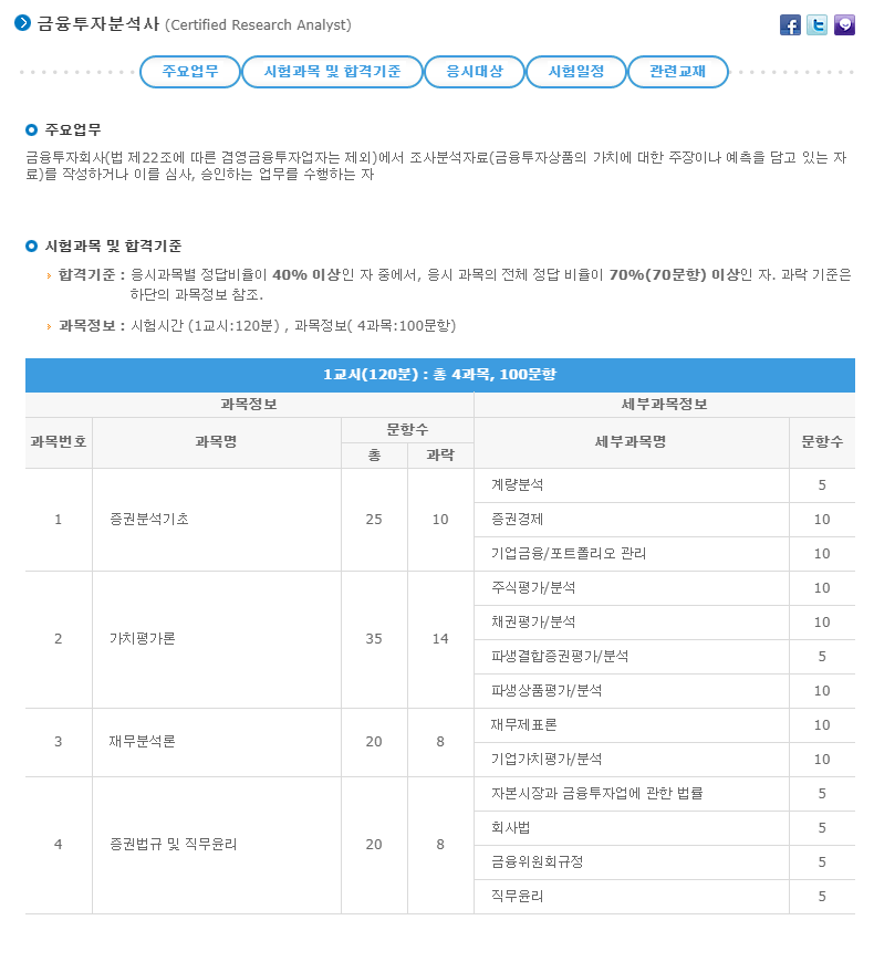 아마 대부분의 사람들이 금융투자협회 자격증 하면 떠오르는 자격증이 아닐까 생각합니다. 펀드매니저로서의 직무수행 능력을 인정받는 자격증입니다. 특히 증권회사에서 일하는 것은 필수 자격입니다. 그래서 자격증의 성격이 자격증보다 강하고, 난이도는 금융위험관리사, 금융투자분석사보다는 조금 낮다고 하시는 분들도 계십니다. 그런데 생각보다 기억에 남는 게 많다. 각종 금융 및 은행 전문자격 중 취업에 가장 도움이 되는 자격이자 가장 인기가 높은 시험이기도 합니다 경영학 전공자, 경제학 전공자는 최소 2~3주 소요되며 시간적 여유가 있다면 충분히 공부할 수 있습니다 길어야 3~4개월.금융 투자 분석가