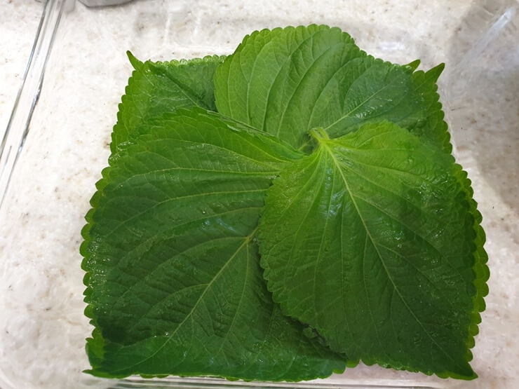 7. 깻잎 2장을 먼저 깔고 용기 바닥에 깔아줍니다.