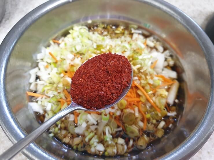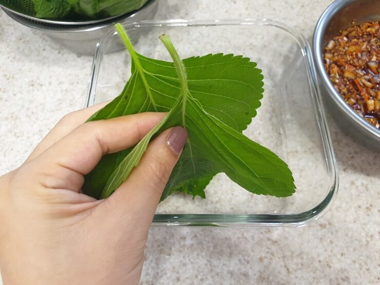 8. 소스를 한 스푼 부어 깻잎에 골고루 펴 발라주세요.