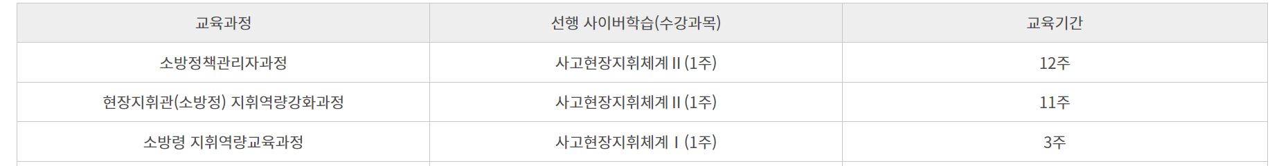 월별 교육훈련계획서를 보면 등록기간, 과정명, 훈련기간, 훈련인원, 훈련계획 및 방법 등에 대한 정보를 볼 수 있다. 주요 교육과정은 신입교육, 리더십교육, 직무교육(집합), 공공부문, 민간부문, 글로벌부문, 소방보조교육, 사이버교육 등이다. 사이버교육의 경우 교육일정 열람 및 교육신청이 가능하며, 국가소방학교 나라학습관에서 ​​교육을 받을 수 있습니다. (아래 중앙소방학원 나라학습관 링크 참조)