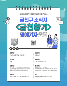 건강산책 ○ 봄꽃 피기 좋은 진촨구 내 체육시설 – 진촨구 시민문화체육관, 첸나이라이문화체육관, 킴빛체육관, 두산시니어체육관, 진촨야구장, 두산동잔디축구장 ○ 블로우 안양천 봄바람 맞으며 걷기 안양천체육시설의 활력을 발휘할 수 있도록 ○ 생활을 함께하는 운동, 금천구체육회장 공징택의 좋은 날 ○ 함께 공부하고, 생활 속에서 배우고, 디지털 문맹 퇴치를 위한 평생학습 방안 ○ 키오스크 그렇게 어렵지 않아! 키오스크 체험존 및 교육상담회 ○ 주택임대차분쟁상담소 운영 및 전문가상담 우리동네모임 ○ 니시키천구에 전국노래자랑 등장! 금천구 KBS전국노래자랑 나도작가 ○ 우리 가족이 그림책을 만든다! 나래북팩토리 이달의 문화소식 ○ 싱그러운 봄바람과 문화 니시키 ○ 고향 사랑 기부 니시키 생활 꿀팁 ○ 봄에는 산불을 예방하자! 산불 자원봉사자를 위한 국가행동요령 ○ 지역자원봉사단 ‘룰루랄라’, 금천인민위원회를 소개 ○ 민구기자 원고 발간 – 평등한 변화의 물결, 우리는 당신과 함께 – 골드동! 킴, 뭐해?금천구 구징작은도서관연합 ○ 운영- 불법주차 SMS 알림서비스 신청- 독산장례식장 주변 불법주차단속 집중(시흥대로 114길 5)- 제3기 금천국민청소년단 참가자 모집 국악경연대회 정조인사 – 봄 광견병 예방접종 – 고향 숨은 영웅 찾기 – 2023년 지역동물병원 의료비 지원 – 청담종합사회복지관 주민단체 “환경지킴이 에코리더” 모집 참가자 진로체험과정 복지건강 ○ 추모 2023년 제43회 장애인의 날, “밝은 복지세상을 그리다” – 어린이구강건강 및 초등치과 학생치과 신청사업 – 대사증후군 무료검진 – 어린이 의료비 지원 희귀질환 환자사업 – 암환자 의료비 지원 지원 – 야오보건소 모집 – 금천구보건소 고혈압·당뇨교실 신청 – 서울형 입원환자 생활비 지원(서울형 유급병가) 서남권 워킹맘지원센터 노동법 무상교육 김천문화 ○ 한율 중학교 ‘우리 학교 가는 길’ 학생 작품 <草、墙和我> 함께해요 ○ 귀화 종합평가 안내 ○ 금천구의회, 터키 지진재해구호기금 전달 ○ 금천구의회 제242차 특별회 폐회