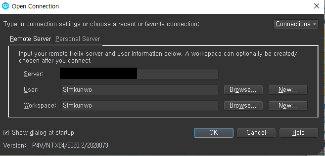 소스 제어 로그인 창에서 Perforce에 동일한 서버, 사용자 이름 및 작업 공간을 등록합니다.
